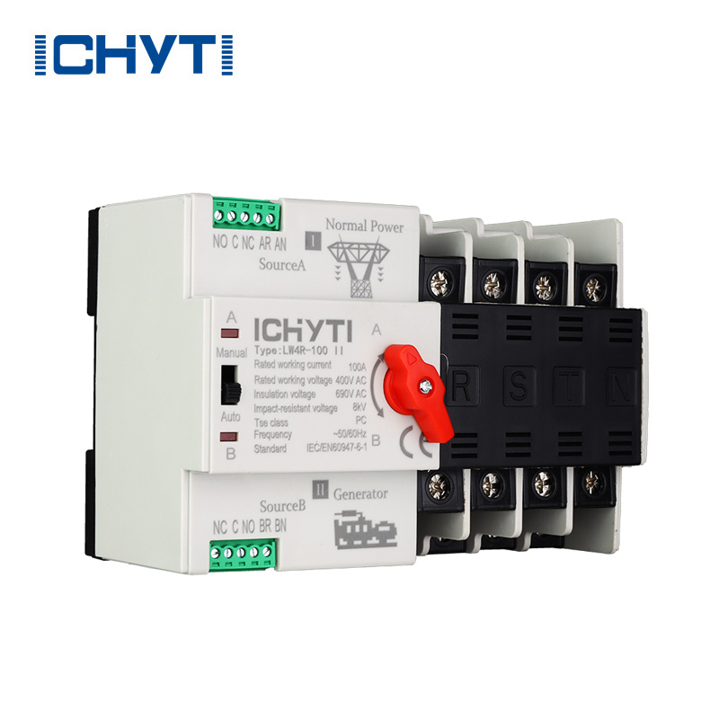 China Factory ICHYTI 100amp automatische omschakelaar is ideaal voor noodstroomvoorzieningssystemen met 400V en 100A AC-vermogen bij 50 of 60Hz. Het compacte ontwerp, de betrouwbare overdrachtsfunctionaliteit, de eenvoudige installatie en het onderhoud en de lange levensduur maken het tot een populaire keuze. De automatische omschakelaar 100 ampère is geschikt voor diverse toepassingen waarbij een continue stroomvoorziening essentieel is en kan zowel elektrisch als handmatig worden bediend. De automatische omschakelaar van 100 ampère uit de LW2R-serie voldoet aan de vereisten van IEC60947-6-1 voor laagspanningsschakelapparatuur en voorschakelapparatuur.