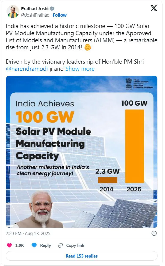 Prahad Joshi, minister van de Indian New Renewable Energy Alliance, benadrukte deze prestatie en verklaarde: “India heeft een historische mijlpaal bereikt – volgens de Approved Models and Manufacturers List (ALMM) heeft de productiecapaciteit van fotovoltaïsche zonnepanelen de 100 gigawatt bereikt, een aanzienlijke stijging ten opzichte van de 2,3 gigawatt in 2014! Onder het visionaire leiderschap van premier Narendra Modi en de drijvende kracht achter transformatieve initiatieven zoals als het Efficient Solar Module Production Linked Incentive Scheme (PLI) bouwt India aan een sterk en zelfvoorzienend ecosysteem voor de productie van zonne-energie. Deze prestatie zal het tempo richting Atmanirbhar Bharat verhogen en India helpen zijn doel te bereiken om tegen 2030 een productiecapaciteit van 500 gigawatt aan niet-fossiele energie te bereiken.