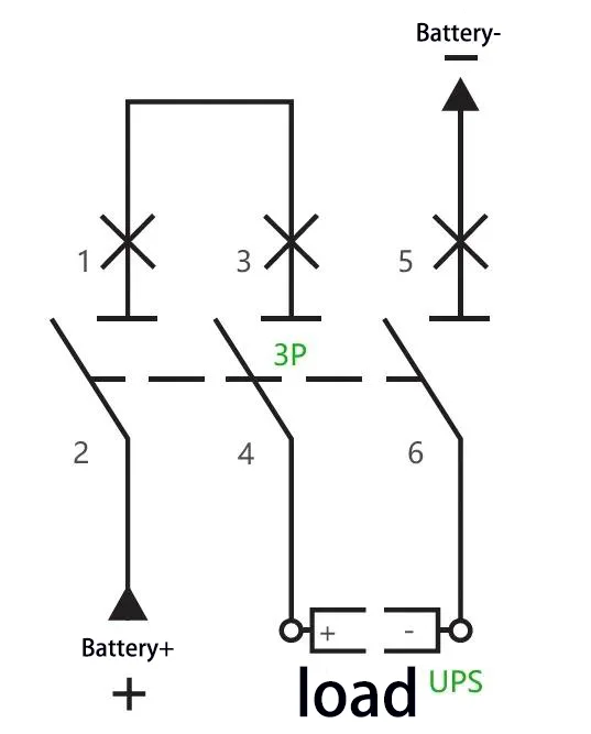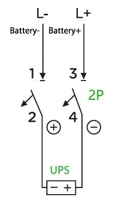 C:Bijvoorbeeld: voor een UPS met een capaciteit van 40 kVA en een nominale batterijreeks van 40 cellen (egaliserende laadspanning: 14 V × 40 = 560 V), wordt de maximale bedrijfsstroom berekend als 40 kVA × 1,0 ÷ 90% ÷ 10 V ÷ 40 = 111 A. Er kan een 3P 750 V 150 A stroomonderbreker worden gebruikt, waarbij twee van de polen zijn aangesloten serie. De bedradingsmethode is als volgt: