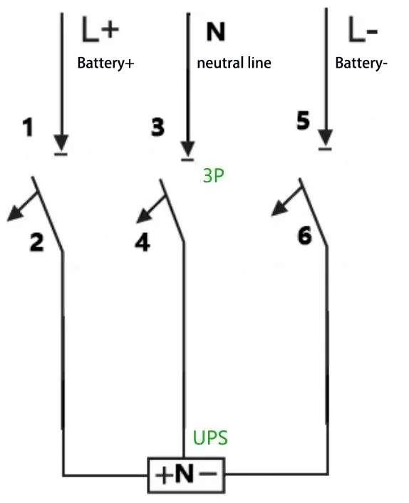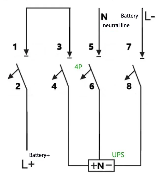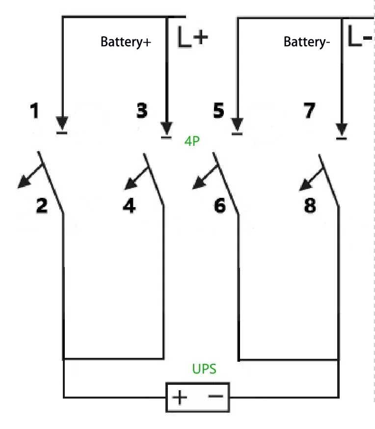 E:Bijvoorbeeld: voor een UPS met een capaciteit van 40 kVA, een nominale batterijreeks van 40 cellen en een neutrale draadverbinding (egaliserende laadspanning: 14 V × 40 = 560 V, d.w.z. ±280 V), wordt de maximale bedrijfsstroom berekend als 40 kVA × 1,0 ÷ 90% ÷ 10 V ÷ 40 = 111 A. Een 4P 750 V 150 Er kan een stroomonderbreker worden gebruikt, waarbij twee van de polen in serie zijn geschakeld. De bedradingsmethode is als volgt: